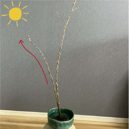今回は、「本勝手」で生けていますので、左後ろに太陽があると考えて生けます。
