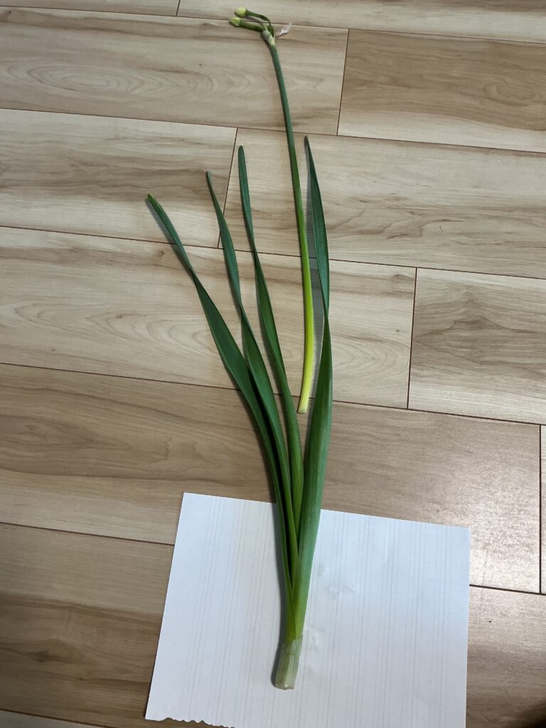 ①葉が4枚の株を選びます。葉がしっかり上を向いていて、元気なものを選ぶといいそうです。手の甲で、水仙の「はかま」の部分を押しながら、左右にゴロゴロします。